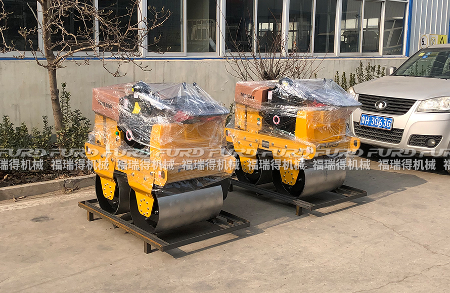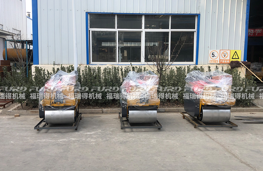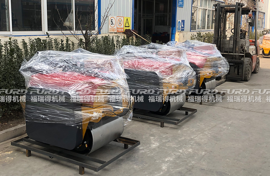福瑞得機(jī)械5臺手扶雙輪壓路機(jī)打包裝箱出口南非
