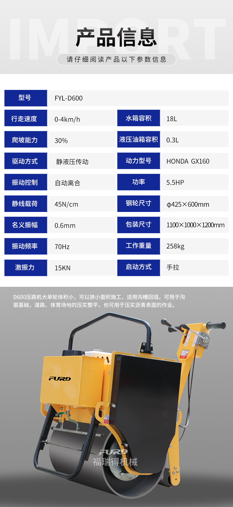 福瑞得 FYL-D600 小型手扶單輪壓路機