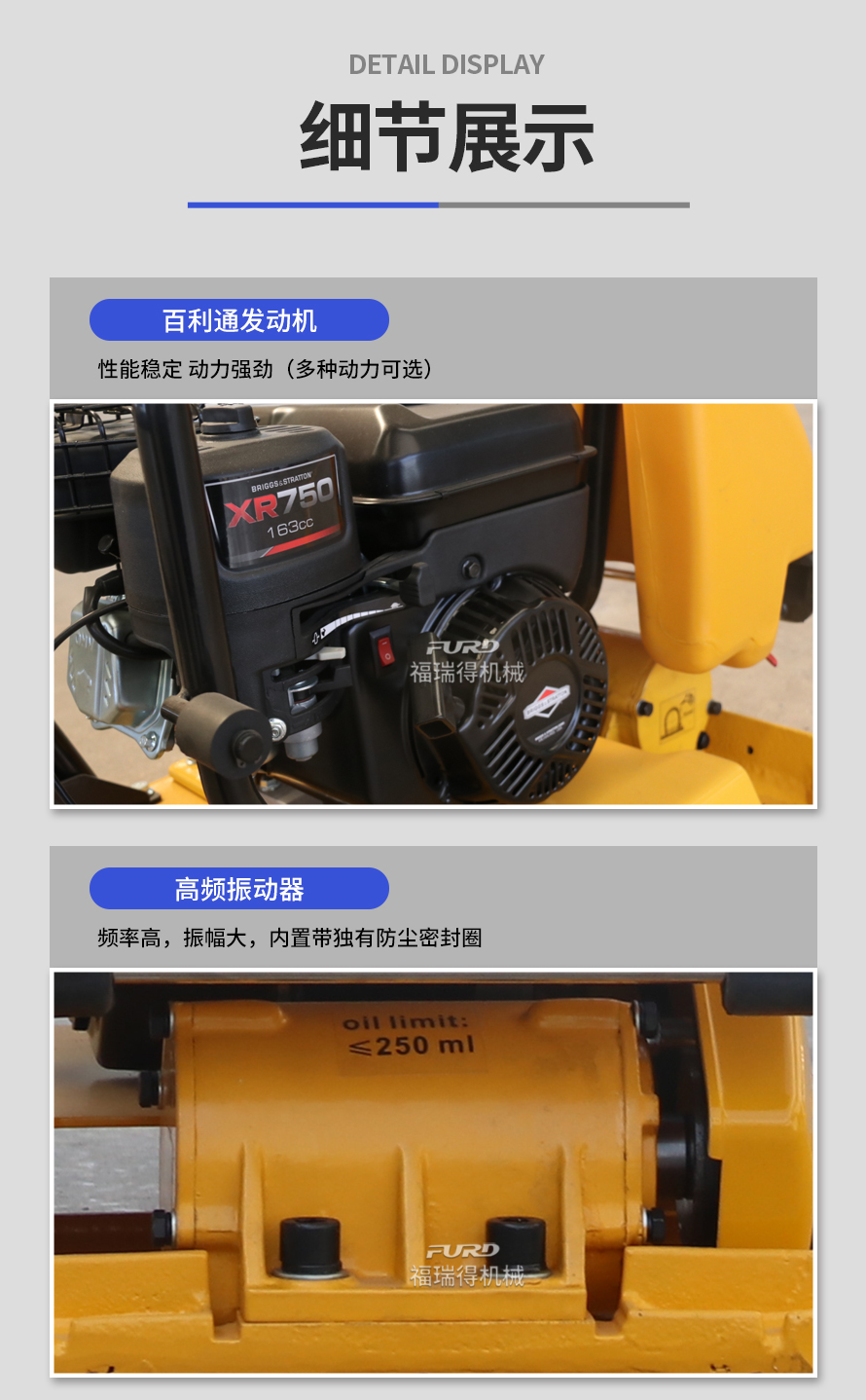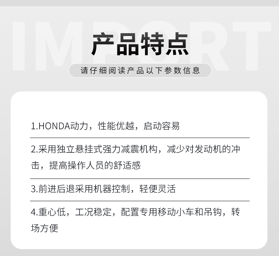 適用于路基邊緣、橋涵、管道、溝槽底部等狹長地帶的壓實(shí)。 本田汽油動(dòng)力,名牌品質(zhì)保證。