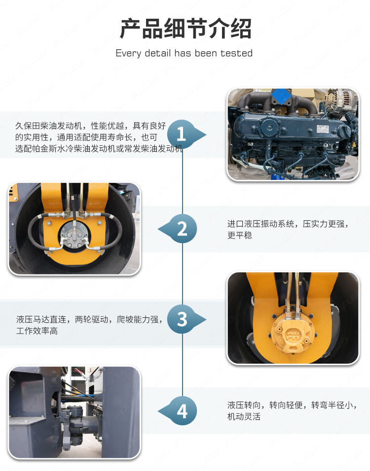 FYL-1200T為橡膠輪胎振動(dòng)壓路機(jī),該壓路機(jī)前有鋼輪,后有橡膠輪,結(jié)合鋼輪和輪胎壓路機(jī)的優(yōu)點(diǎn),具有更高的工作效率。