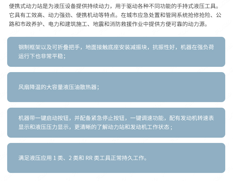 適用于路面搶修、道路施工、市政維護(hù)、保養(yǎng)、園林等工作場景 ;.設(shè)備安裝便捷,搬運簡便,適應(yīng)性強,可輕松解決破碎、切削、分裂、打樁、壓實等施工項目。